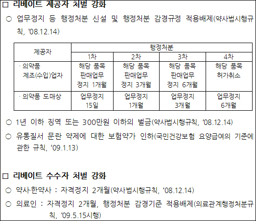 즉 리베이트를 제공한 제약사는 1차로 해당 품목 판매업무 정지 1개월이, 도매상에는 15일의 업무정지 처분이 내려진다.
