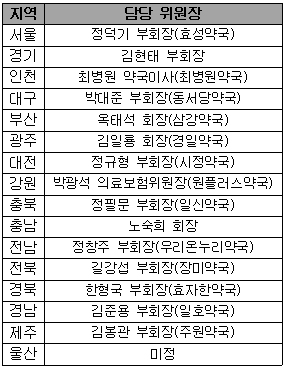 대구지역은 박대준 부회장(동서당약국), 부산지역 옥태석 회장(삼강약국), 광주지역 김일룡 회장(경일약국), 대전지역 정규형 부회장(시정약국), 강원지역 박광석 의료보험위원장(원플러스약국)이 이를 맡는다.