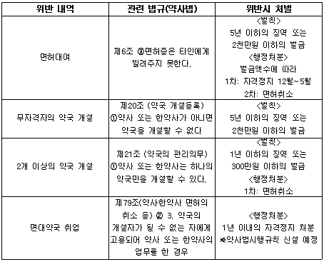 개정된 약사법에 따르면, ▲면허를 대여한 약사 ▲면허를 빌려 약국을 개설한 무자격자 ▲2개 이상의 약국을 개설한 약사 ▲면허대여 약국에 취업한 근무약사 모두를 처벌할 수 있다.