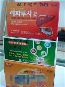 기자가 고개를 끄덕이자, 그는 이내 진열된 약장에서 헤피루사와 A약국에 밖에 없다는 아빈타캡슐을 꺼내온다. 빈속에 먹어도 괜찮다며 헤피루사는 아침저녁으로 1정씩, 아빈타는 아침저녁으로 2정씩 식사후 복용하라고 설명해준다. 덤으로 비타민씨 드링크까지 한 박스 내주었다.
