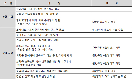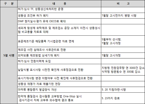 김영찬 의약품안전국장은 "약사법 시행규칙 개정과 같이 시간이 소요되는 몇 가지 개선안을 제외한 50여가지 규제 완화책은 7월까지 시행에 돌입할 계획이다"고 말했다.