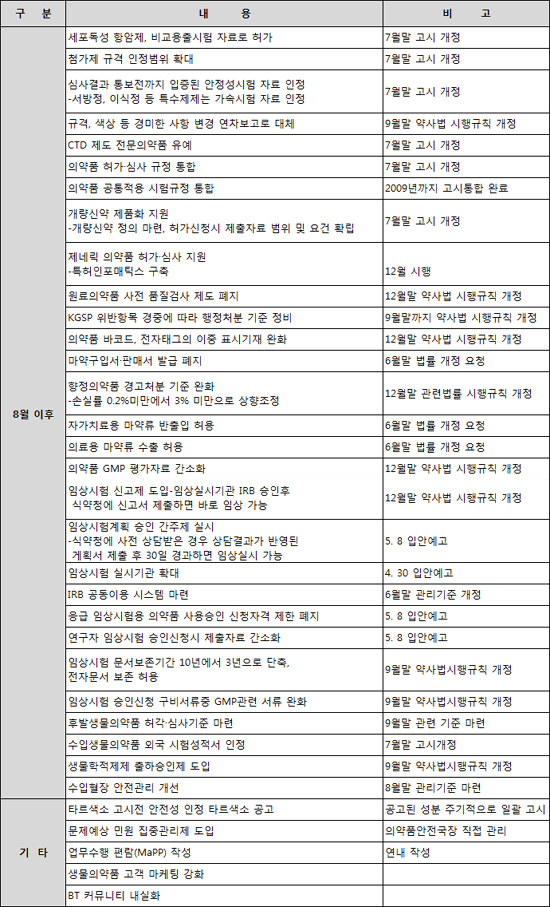 개량신약 제품화 지원에 대한 구체적인 방안도 8월 이후 마련될 전망이다. 식약청은 이미 관련 고시안을 입안예고했으며 7월까지 규개위의 심사를 거쳐 7월말 고시개정을 목표로 하고 있다.