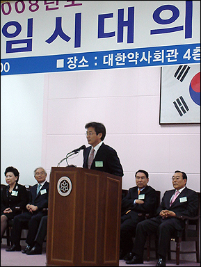 존경하는 대의원 여러분, 대한약사회장 원희목입니다. 바쁘신 일정에도 불구하고 오늘 임시총회에 참석해주신 여러 대의원님들에게 진심으로 감사의 인사를 전합니다. 고맙습니다. 대한약사회는 여러분들의 힘으로 유지되고 있으며, 특히 회가 어려울 때 항상 대의원님들의 힘을 바탕으로 극복해왔습니다. 지금까지 그렇게 해왔듯이 앞으로도 영원히 여러분의 열정으로 전국의 회원이 하나로 단합하여 약사회의 미래를 개척해 나갈 것입니다. 약사회의 발전을 위한 여러분의 헌신에 대해 깊이 머리 숙여 감사드립니다. 우리는 그 동안 많은 변화를 힘들게 겪어 왔고 외부의 도전에 대해 힘을 합쳐 약사의 권익을 지키기 위해 싸워 왔습니다. 약사로서 우리 모두가 하나라는 신념이 있었기에 그 힘든 과정들을 이겨낼 수 있었습니다. 내부의 어떤 갈등도 슬기롭게 극복하면서 오늘까지 달려왔습니다. 도전과 극복의 과정을 함께 한 대한약사회 6만 회원과 대의원여러분들이 너무나 자랑스럽습니다.여러분이 하나로 함께하는 동안 우리의 미래는 밝을 것이라고 감히 말씀드립니다. 존경하는 대의원여러분, 저는 그동안 대한약사회 직선 1기 및 2기 회장으로서 여러분의 과분한 사랑을 받으며 회무에 전념해왔습니다. 언제나 저의 중심은 약사회였습니다. 약사회를 생각하지 않고서는 제 인생 어느 부분도 존재할 수 없는 세월이었습니다. 제가 여러분의 애정을 바탕으로 제18대 총선에 있어 국회에 진출하게 되었습니다. 여러분이 베풀어 주신 사랑에 깊이 감사드립니다. 어느 자리에 있더라도 저의 중심이 약사회라는 사실을 잊지 않고 우리의 미래를 위해 노력할 것입니다. 존경하는 대의원여러분 그리고 전국의 회원여러분, 여러분이 저에게 부여해주신 임기를 다 마치지 못하게 된 점에 대해 죄송스럽게 생각합니다. 하지만 제가 가는 그 길도 역시 우리 모두가 원하고 함께 하는 길이라는 굳은 신념으로 당당하게 걸어가도록 하겠습니다. 국회에서 제대로 활동하는 것이 회원님들의 뜻을 따르는 것이라는 생각으로 살아가도록 하겠습니다. 저는 이미 5월 말 국회 개원에 맞추어 회장직을 사임하겠다는 뜻을 밝힌 바 있으며 이로 인해 보궐 선거가 불가피한 상황이 되었습니다. 보궐선거에 대해 우리 내부에 여러 가지 논란이 있는 것으로 알고 있습니다. 또 일부 잘못 알려진 사실로 인해 오해도 있는 것 같습니다. 우리는 하나입니다. 약사라는 동질성과 공동체 의식으로 갈등을 극복해왔습니다. 이번 보궐 선거 문제로 약사회가 갈등을 만들어내서는 안됩니다. 우리 앞의 여러 환경이 예사롭지 않은 지금 더 단단하게 뭉쳐야 합니다. 저의 사임으로 인한 후임회장 선출을 둘러싼 직선 간선 논란이 우리 약사회를 분열이나 갈등의 구도가 만들어지고 내부가 분열되는 것은 절대 원하지 않습니다. 솔직하게 말씀드려서 간선방식으로 보궐선거를 진행하면 5월 중에 후임회장을 선출하고 적은 시간이나마 후임회장에게 여러 업무와 중요한 회무 포인트 등을 인수인계 하는 것이 중요하다는 생각을 가졌습니다. 임기를 다하지 못하고 떠나는 저의 미안함에서 회무 공백을 줄여보자는 생각을 했었고 지난 이사회에서 회무공백 최소화를 위한 간선제 보궐선거 검토안이 나오게 된 것입니다. 며칠 전에도 담화문을 통해 밝혔듯이 이런 모든 문제를 오늘 임시총회에서 논의하자는 뜻이었습니다. 직선이냐 간선이냐가 아닌 현재 우리 상황에서 우리가 어떤 선택을 할 수 있는 것인지 여러 가능성에 대해 문을 열고 의논하자는 뜻이었습니다. 하지만 직선 간선 논쟁으로 인해 약사회가 논란에 빠지는 것을 보고 마음이 너무 아팠습니다. 약사회의 단결을 저해하는 어떤 상황도 우리는 용납해서는 안 됩니다. 우리는 지금까지 하나였고 앞으로도 영원히 하나의 모습으로 하나로 단결된 힘으로 나아가야 합니다. 존경하는 대의원 여러분, 저는 보궐선거를 현행 정관대로 진행할 것을 제안합니다. 회무공백을 줄이고자 했던 여러 이사님들의 충심을 이해합니다. 특히 간선으로 뜻을 모아 주신 대의원여러분들의 약사회를 사랑하는 충심에 진심으로 감사드립니다. 또한 정관 규정을 중심에 둔 원칙론도 이해합니다. 간선에 의견을 모아주신 원로선배님들, 그리고 자문위원님들의 충심어린 고언 너무 감사합니다. 클 틀에서 약사회를 걱정하고 모아주신 대의원 여러분 정말 고맙습니다. 이 모든 것이 약사회를 중심에 놓고 약사회의 발전을 위한 의견들이라는 것을 잘 알고 있습니다. 그러나 이 문제로 약사회가 분열하거나 내부 갈등이 있는 것처럼 비쳐지는 것은 절대 안 됩니다. 이제 우리 약사회가 직선 간선 논쟁에서 벗어나 하나로 뭉쳐 미래를 향해 나아가야 합니다. 지금은 위기상황입니다. 정권교체의 결과와 새 정권의 정책방향이 우리에게 어떤 영향을 줄지 위기감을 가지고 슬기롭게 대처해나가야 합니다. 그런 의미에서 한 뜻으로 마음을 모아 저의 제안을 받아들여 주시기를 간곡히 부탁드립니다. 존경하는 대의원 여러분, 우리 앞의 환경은 그 어느 때 보다 험난하기만 합니다. 약사회를 둘러싼 보건정책 환경은 이전과 
