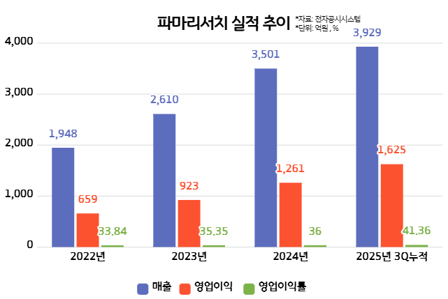 파마리서치의 지난 4년간 연간 실적에서 매출 신장률은 연평균 74%대가 유지되고 있다. 매출 추이를 보면 2022년 1948억원, 2023년 2610억원, 2024년 3501억원을 기록했고, 올해 3분기까지는 3930억원으로 집계된다. 같은 기간 영업이익은 2022년 659억원, 2023년 923억원, 2024년 1261억원, 지난해 3분기 1625억원이다. 영업이익률은 2022년 33.84%에서 지난해 3분기 41.36%로 수익성이 강화됐다.