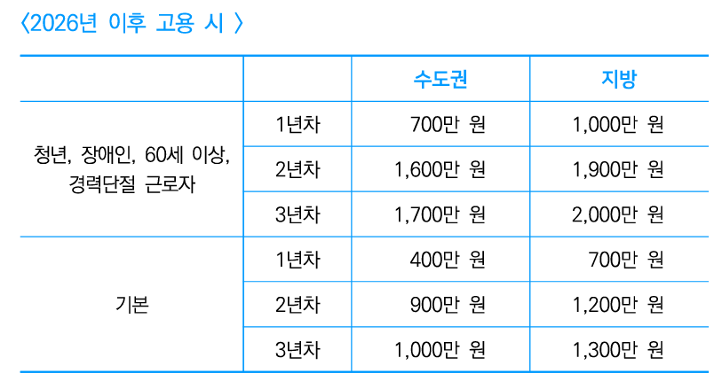 2026년 이전 고용 시에는 3년간 동일한 금액을 공제했고 만약 고용한 인원이 감소한다면 공제받은 금액을 전액 추징했다. 반면 2026년 이후 고용 시에는 연도별로 더 높은 금액을 공제하며, 고용한 인원이 감소하더라도 이미 공제받는 금액을 추징하지 않는다.