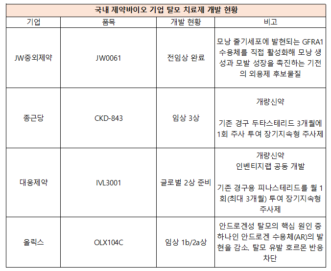 업계 관계자는 "탈모 치료제는 장기간 투여가 전제되는 만큼 기존 남성호르몬 억제나 혈관 확장 기전에서 나타났던 부작용을 개선한 신약에 대한 미충족 수요가 여전히 크다"며 "혁신적인 기전의 치료제가 등장할 경우 시장 파급력은 상당할 수 있다"고 말했다.