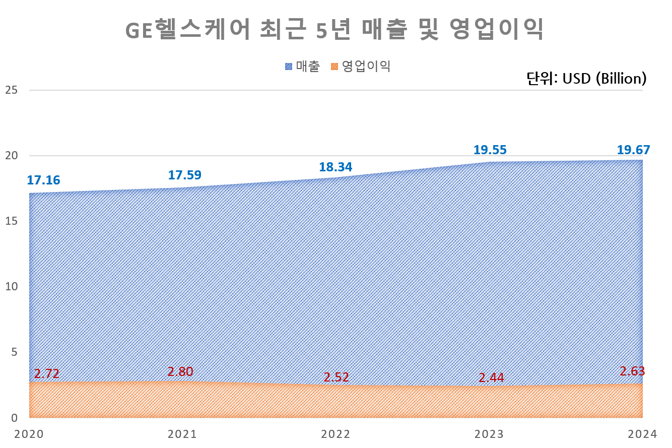 최근 5년간 GE헬스케어 글로벌 매출을 살펴보면 2020년 171억6000만 달러를 기록한 이후 2021년 175억9000만 달러, 2022년 183억4000만 달러, 2023년 195억5000만 달러, 2024년 196억7000만 달러로 증가세를 이어갔다.