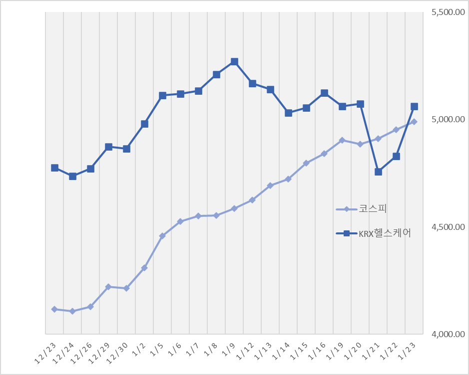 지난 23일 KRX헬스케어지수는 작년 말 4865.56에서 4.1% 상승했다. 같은 기간 코스피지수가 18.4% 상승한 것과 비교하면 매우 저조한 성적표다. 이날 코스피 지수는 전 거래일보다 0.76% 상승한 4990.07로 종가 기준 사상 최고치를 기록했다. 코스피 지수는 지난 22일과 23일 이틀 연속 장중 5000포인트를 넘으며 유례없는 호황을 지속 중이다.