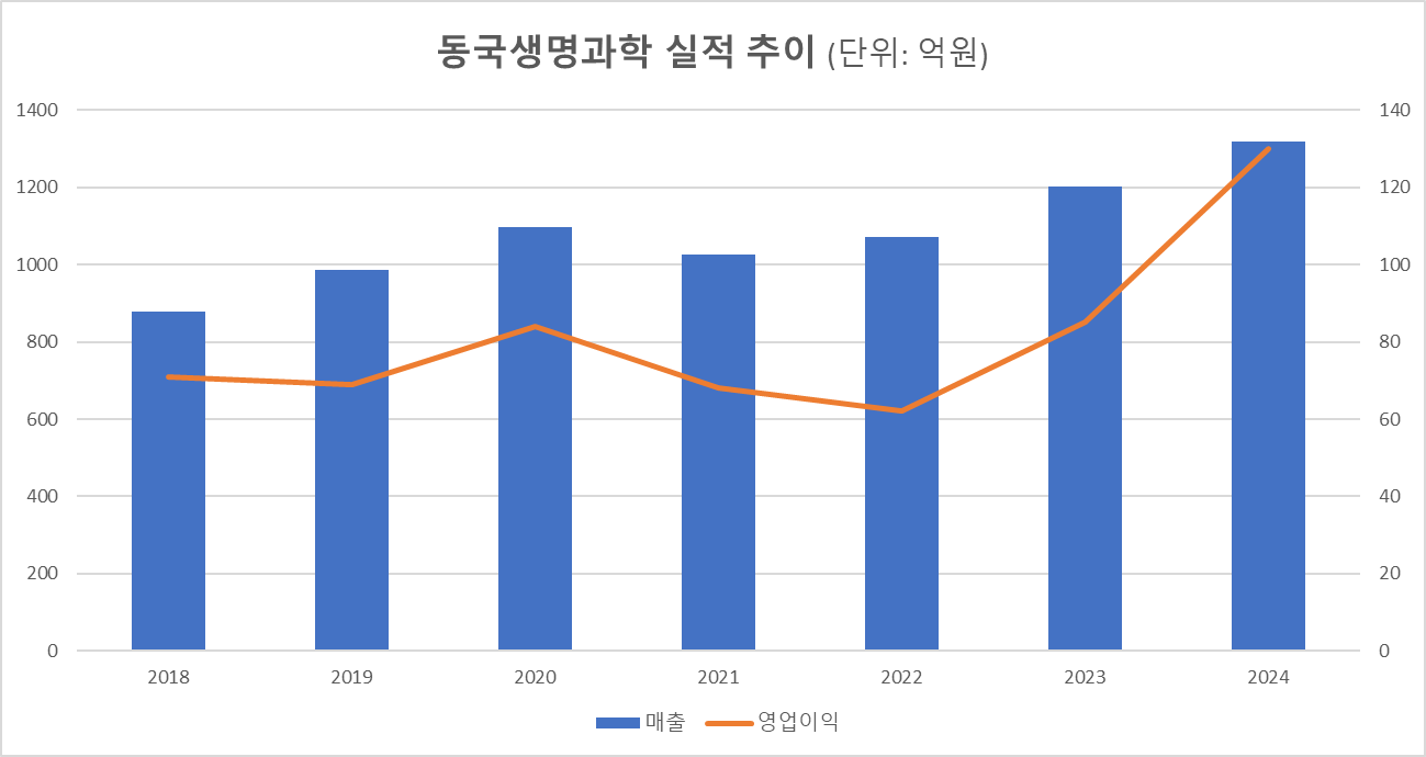 동국생명과학 매출이 전년 대비 감소한 것은 2021년 이후 4년 만이다. 동국생명과학은 2020년 매출 1096억원으로 처음으로 1000억원을 돌파한 이후 2021년 1027억원으로 소폭 감소했다. 이후 2022년 1072억원, 2023년 1201억원, 2024년 1318억원으로 다시 성장 궤도에 올라서며 매년 외형을 키웠다. 출범 당시 매출 505억원과 비교하면 7년 새 매출은 161.1% 증가했다. 이번 매출 감소는 최근 수년간 이어진 고성장 국면 이후 일시적인 조정 국면에 들어선 것으로 풀이된다.
