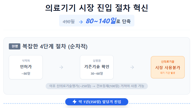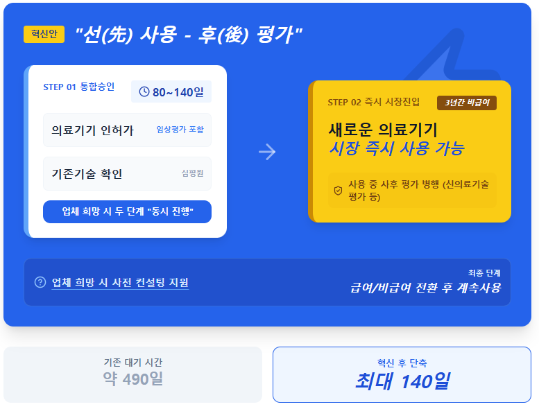 현재 운영 중인 '혁신의료기기 통합심사' 트랙은 식약처 허가와 보험 등재까지 약 400일이 소요되지만, 이번 신설 유예 트랙은 약 80일이면 현장 진입이 가능하다는 계산이 나온다.