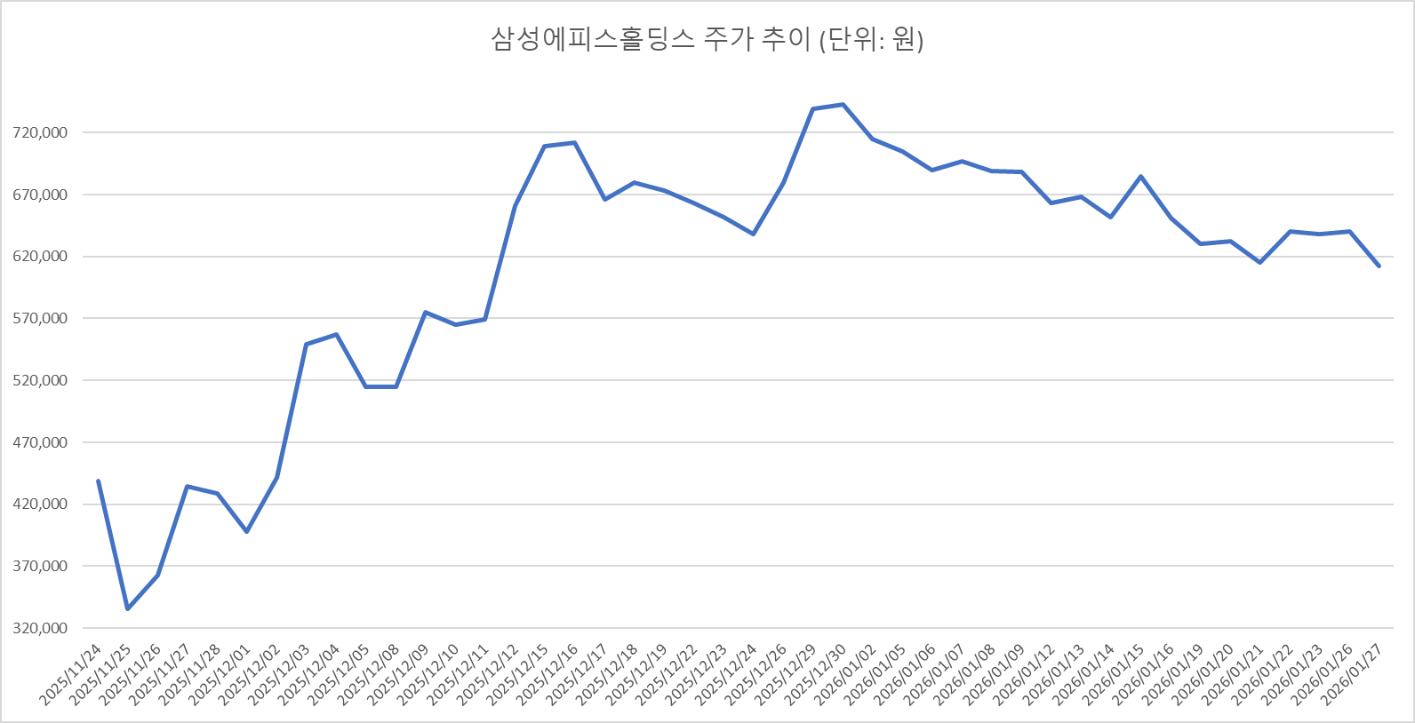 삼성에피스홀딩스는 변경 상장 첫날 시초가 61만1000원 대비 28.3% 하락한 43만8500원으로 장을 마감했다. 이후 이튿날인 지난해 11월 25일에는 33만5500원까지 밀리며 최저점을 기록했다. 분할 직후 유통 물량 증가와 지주회사 구조에 대한 가치 평가 불확실성이 동시에 작용하며 주가 변동성이 커진 것으로 풀이된다.