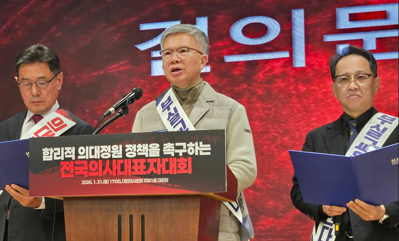 결의문 전문 대한민국 의료는 지금 벼랑 끝에 서 있다. 비과학적이고 비합리적인 의대 증원 추진으로 대한민국 의료 시스템의 근간은 뿌리째 흔들리고 있고, 보호받아야 할 의학교육의 현장은 이미 회생 불능의 지경으로 내몰리고 있다. 우리 전국의사대표자들은 무능한 행정 권력이 초래한 이 국가적 재앙 앞에 더 이상 침묵할 수 없다. 우리는 오늘, 대한민국 의료의 미래를 복구하고 의학교육 수호의 최후 보루가 되기 위해, 14만 회원의 거대한 분노를 하나로 모아 다음과 같이 결의한다. 하나, 정부는 앞으로 다가올 2027년 의학교육 현장의 현실을 인정하고 졸속 증원을 즉각 중단하라! 강의실도, 교수도 없는 현장에서 수천 명의 학생을 한데 몰아넣는 것은 정상적인 교육이라 할 수 없다. 휴학생과 복귀생이 뒤엉키는 사상 초유의 더블링 사태는 의학교육의 사망 선고이며, 이는 곧 실력 없는 의사 양산으로 이어져 국민의 생명을 위협할 것이다. 우리는 현장이 수용할 수 없는 그 어떤 숫자도 결코 용납하지 않을 것이며, 교육의 질을 포기한 정부의 반 지성적 행태에 결사 항전할 것이다. 하나, 국민의 미래를 유린하는 천문학적 건보 재정 파탄의 진실을 밝히라! 준비되지 않은 의대 증원은 수백조 재정 재앙을 미래세대에게 물려줄 것이다. 정부는 증원의 허울 좋은 명분 뒤에 숨겨진 건보료 폭탄의 실체를 국민 앞에 정직하게 공개해야 한다. 우리는 국민의 경제적 고통을 담보로 생색내기에만 급급한 정부의 기만행위를 낱낱이 고발하며, 국가 의료 체계의 공멸을 막기 위해 모든 수단을 동원해 저항할 것이다. 하나, 정부가 전문가의 목소리에 끝내 귀를 기울여 주지 않는다면 우리는 14만 회원의 단일대오로 총력대응에 나설 것을 선언한다. 우리는 마지막 순간까지 대화를 통한 합리적 해결을 갈구해 왔다. 하지만 정부가 전문가 다수의 의견을 묵살하고 가짜 숙의를 강요한다면, 우리는 더 이상 인내하지 않을 것이다. 우리는 오늘 이 자리를 기점으로 투쟁의 선봉에 설 것이며, 정부가 파멸의 길을 선택하는 순간 우리는 주저 없이 의료의 정의를 바로 세우기 위한 거침없는 행진을 시작할 것임을 엄중히 경고한다. 2026년 1월 31일 전국의사대표자 일동 |