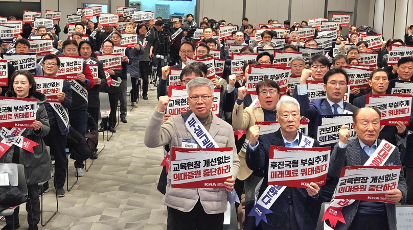 이 자리에서 김택우 회장은 "정부는 2027학년도 의대 정원 확정을 위해 무리하게 시간에 쫓기며 또다시 ‘숫자놀음’을 반복하려 하고 있다"며 "하지만 의학교육은 단순히 강의실에 학생을 채우는 것으로 완성되지 않습니다. 현재 24학번과 25학번 1586명이 휴학 중이며, 이들이 복귀하여 신입생과 충돌하는 2027년은 그 자체로 이미 재난 수준"이라고 밝혔다.