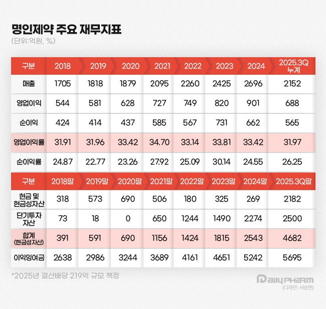 지난해도 흐름을 이었다. 2025년 3분기 누계 기준 영업이익률은 31.04%. 매출 2152억원, 영업이익 668억원이다.