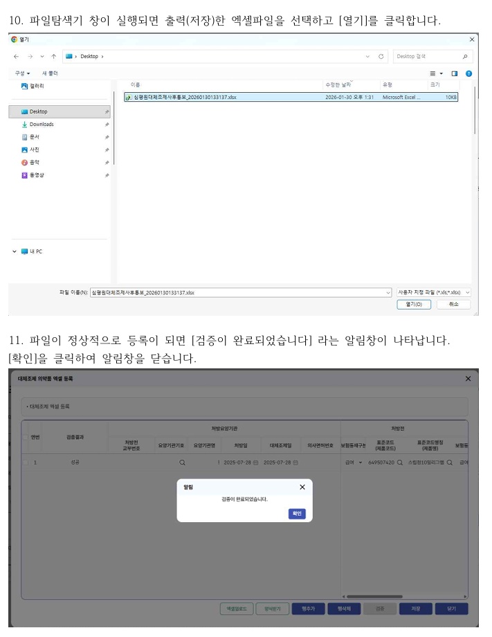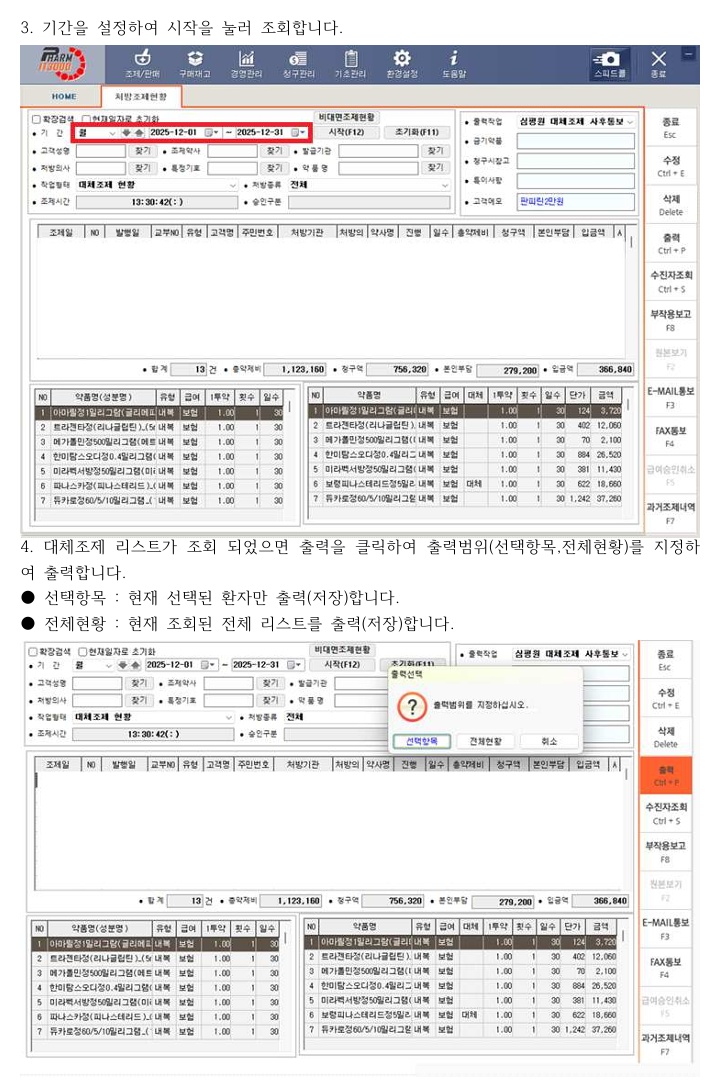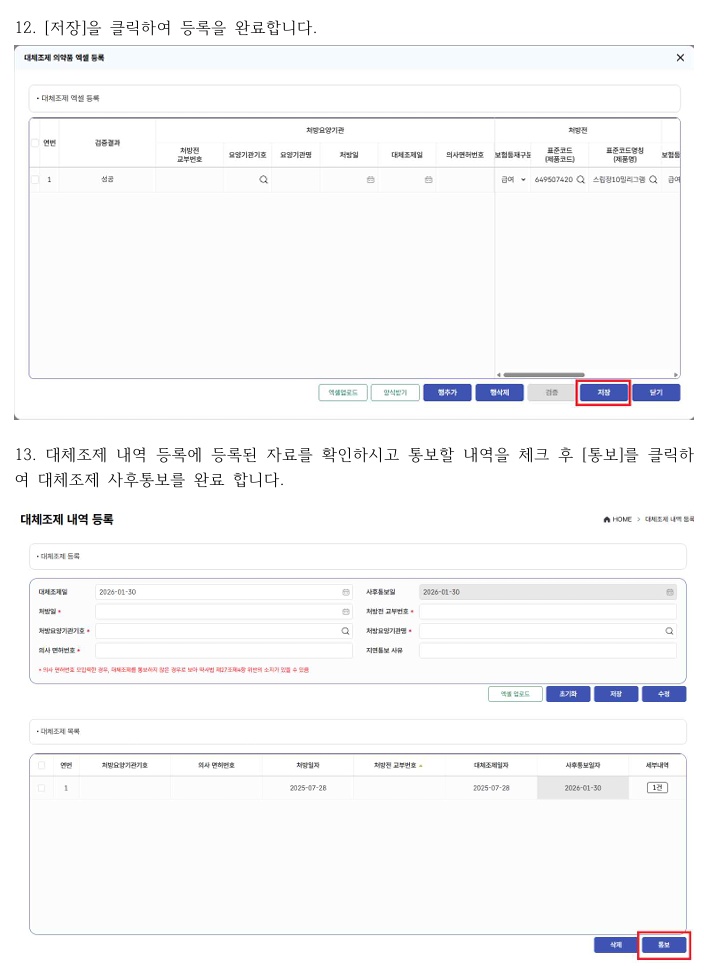 통보 완료 후에는 ‘대체조제 내역 조회’ 메뉴를 통해 세부 내역 확인이 가능하며, 처방 수정이나 입력 오류가 있을 경우 일부 항목은 수정할 수 있다. 다만 대체조제 일자와 통보일은 수정이 불가능해 입력 시 주의가 필요하다.