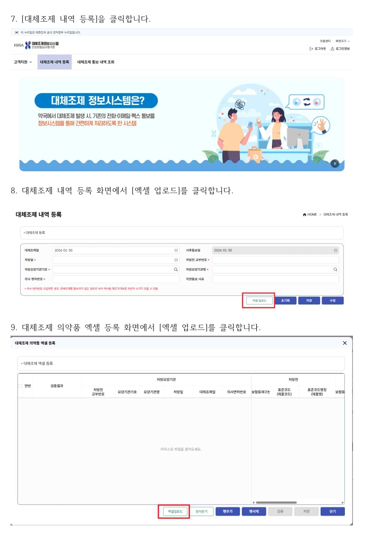 이후 약국은 심평원 정보시스템 웹사이트(ndsd.hira.or.kr)에 약국 공인인증서로 로그인해 ‘대체조제 내역 등록’ 메뉴를 선택한다. 이 부회장에 따르면 개별적으로 입력도 가능하지만, 가장 간편한 방식은 일괄 업로드이며 검증 과정을 거친 뒤 저장·통보 버튼을 누르는 것으로 절차가 마무리된다.