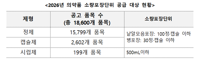 올해 공고된 소량포장 공급 대상 의약품은 정제 1만5799개 품목, 캡슐제 2602개 품목, 시럽제 199개 품목이다.