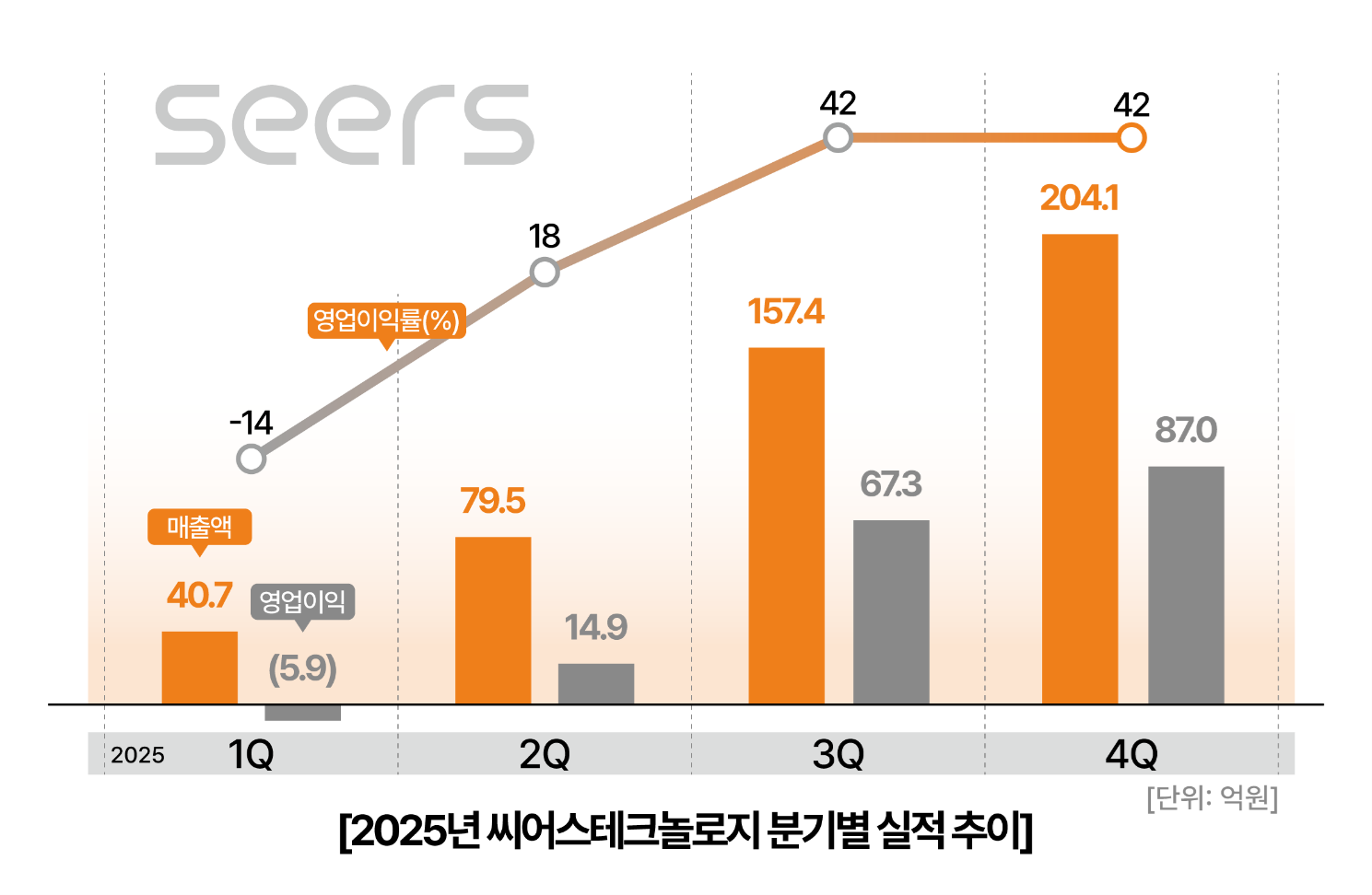 씨어스는 2025년 4분기 매출 204억원, 영업이익 87억원을 기록하며 역대 최대 분기 실적을 달성했다. 이에 따라 연간 기준 매출 481.7억원, 영업이익 163.3억원으로 흑자 전환에 성공했다.
