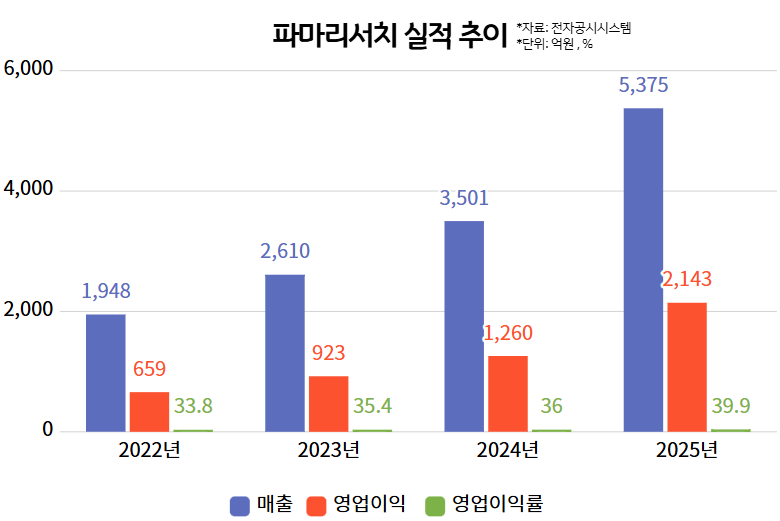 지난해 파마리서치 매출은 5000억원을 돌파하며 사상 최대 실적을 달성했다. 파마리서치 공시에 따르면 2025년 연결 기준 매출액이 5357억원으로, 전년 대비 53% 증가했다. 영업이익은 2142억원으로 지난해보다 70% 늘었다.