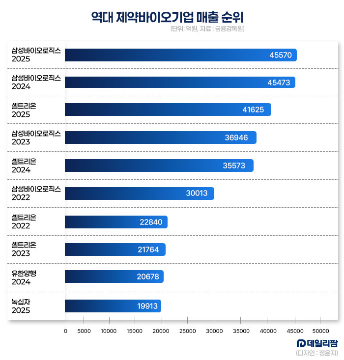 역대 제약바이오기업 매출 순위를 보면 지난해 삼성바이오로직스와 셀트리온이 나란히 4조원을 넘어서며 1, 3위를 기록했다.