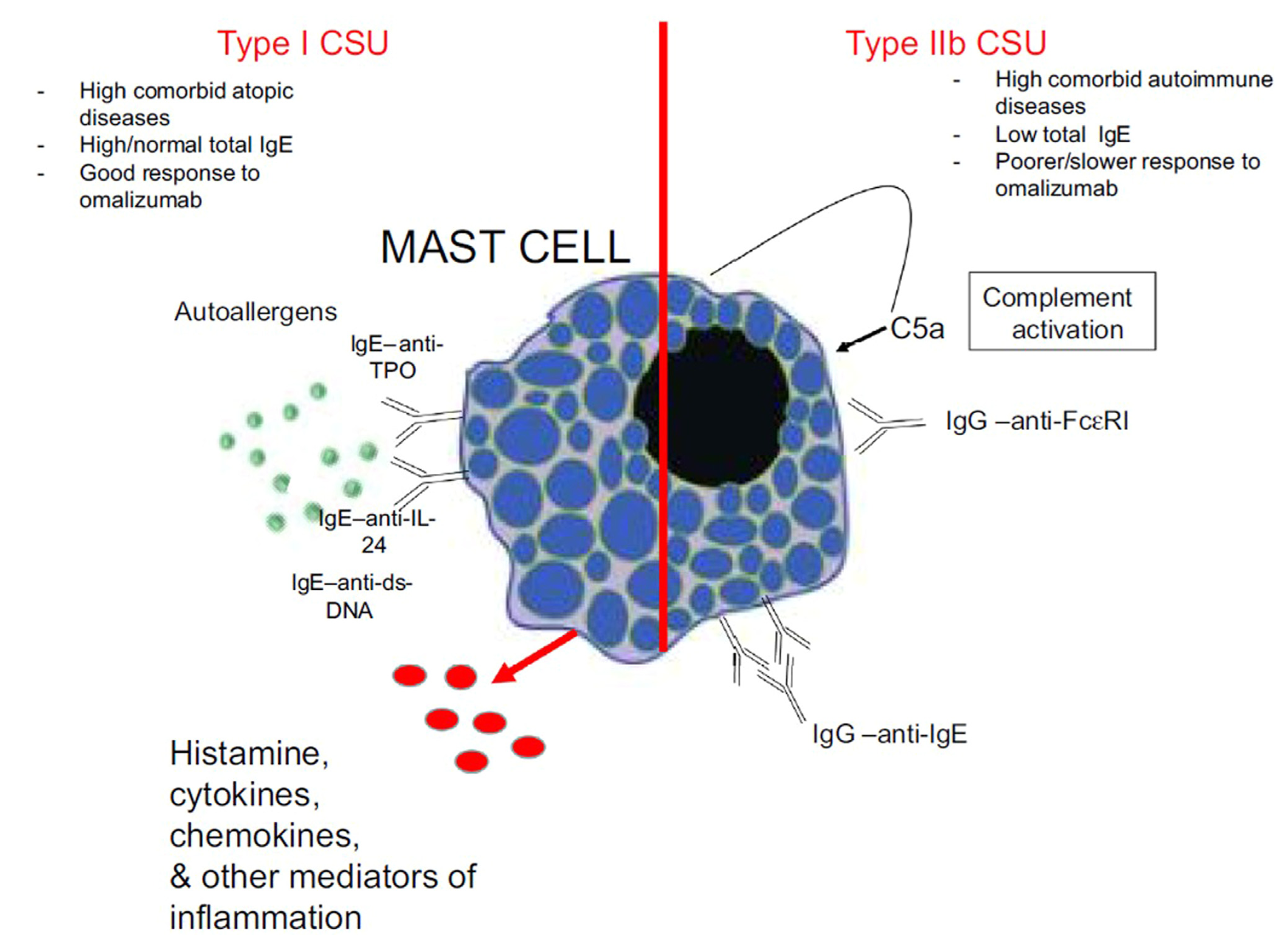 제I형 자가항원 CSU는 자가항원을 표적으로 하는 IgE 항체의 존재를 특징으로 한다. 이 경우 IgE 항체는 갑상선 과산화효소(thyroid peroxidase, TPO), IL-24, DNA, 핵 단백질 등과 같은 자가항원에 결합하여 비만세포 표면의 고친화성 IgE 수용체(FcεRI)를 교차결합시키며, 즉시형 과민반응(type I hypersensitivity)과 유사한 기전을 통해 비만세포 활성화와 히스타민, 사이토카인, 케모카인, 기타 염증매개물질의 분비를 유도한다(Figure 1). 이러한 환자군에서는 총 IgE 수치가 정상 또는 증가되어 있는 경우가 많고, 오말리주맙 치료에 대한 반응성이 비교적 양호한 것으로 보고되고 있다.