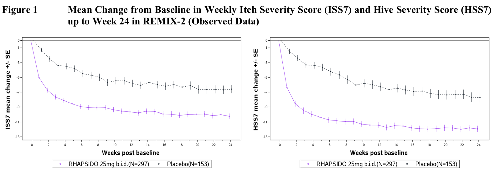 Figure 1은 REMIX-2 연구에서 RHAPSIDO로 치료받은 환자들을 대상으로 24주차까지 시간 경과에 따른 RHAPSIDO의 효과를 보여준다. REMIX-1에서도 유사한 결과가 관찰되었다.