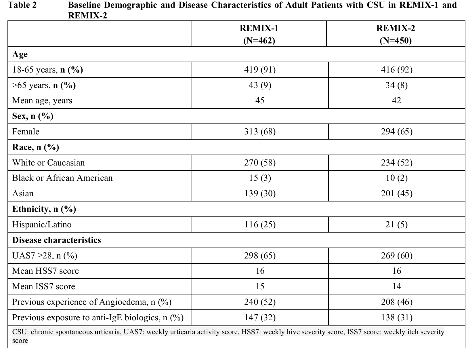 치료군 전반에서 등록 시점의 CSU 평균 유병 기간은 REMIX-1과 REMIX-2에서 각각 6.6년과 5.2년이었으며, 환자의 39%와 29%는 CSU 유병 기간이 5년을 초과하였다.