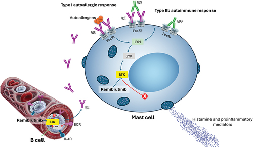 BTK는 전통적으로 B 세포 수용체(B cell receptor, BCR) 신호전달에 필수적인 분자로 인식되어 왔다. 그러나 최근 연구에 따르면 BTK는 B 세포뿐 아니라 비만세포와 호염기구에서도 발현되며, FcεRI 활성화 이후 하위 신호전달을 증폭시키는 역할을 한다. 이러한 특성으로 인해 BTK는 만성 자발성 두드러기(CSU)의 병인에서 핵심 분자로 주목받고 있다.