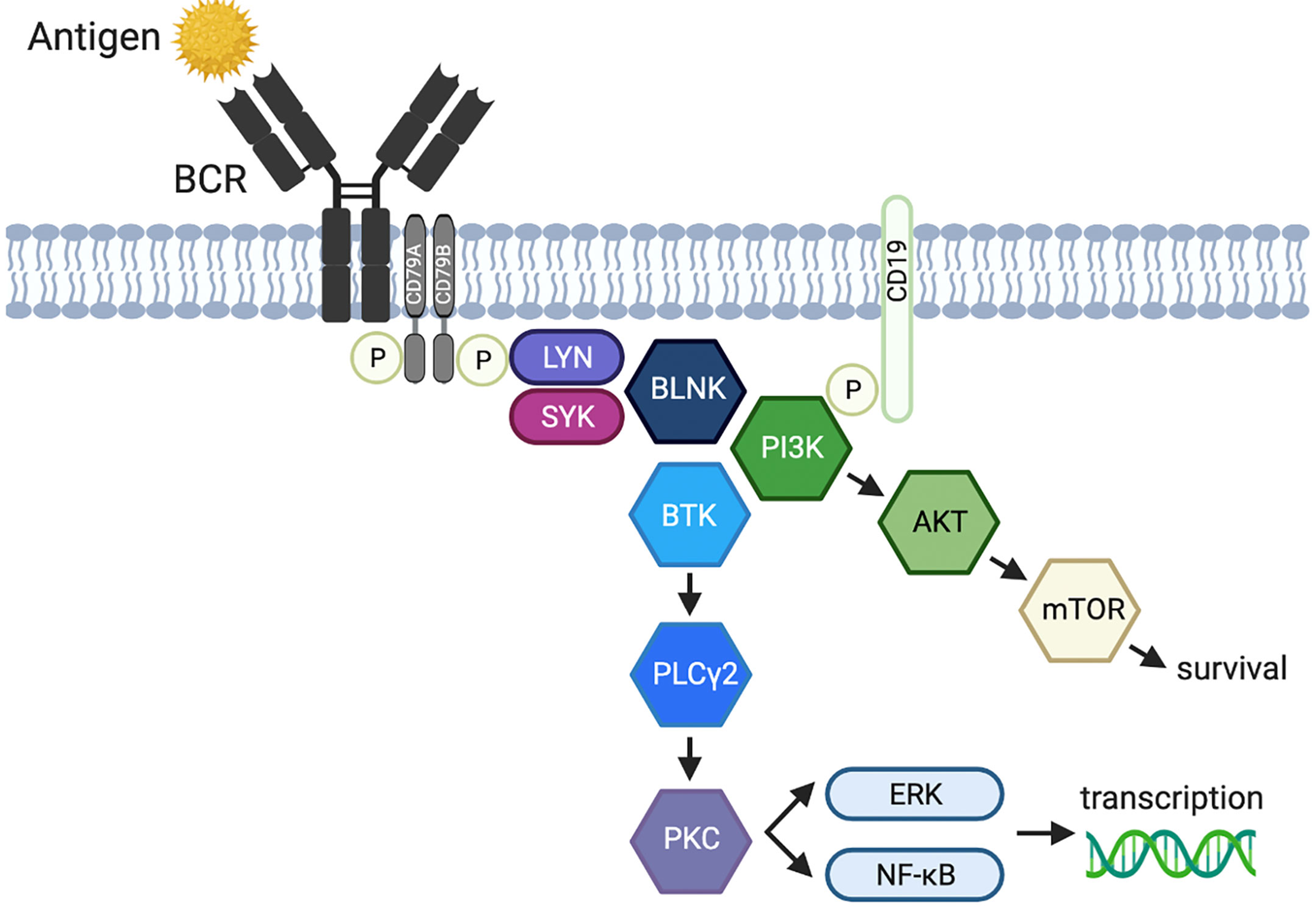 BCR이 항원을 인식하면 Src family kinase(Lyn 등)에 의해 Igα/Igβ의 ITAM이 인산화되고, 이에 결합한 Syk 티로신 키나아제가 활성화된다. 활성화된 Syk는 어댑터 단백질(BLNK 등)과 BTK를 포함한 하위 신호전달 분자들을 인산화 및 활성화하며, 이 과정에서 BTK는 PI3K에 의해 생성된 PIP3에 결합하여 세포막 인근으로 이동해 완전히 활성화된다. 활성화된 BTK와 Syk는 phospholipase Cγ2(PLCγ2)를 인산화하여 활성화하고, 활성화된 PLCγ2는 PIP2를 절단하여 inositol trisphosphate(IP3)와 diacylglycerol(DAG)을 생성한다.