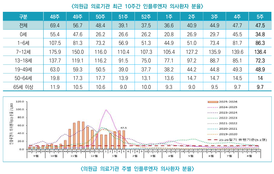 1월 25일부터 31일까지의 질병청 통계를 보면 의원급 의료기관 외래환자 1000명당 인플루엔자 의사환자 수는 47.5명으로, 2025~2026절기 인플루엔자 유행기준인 9.1명을 훌쩍 넘겼다.