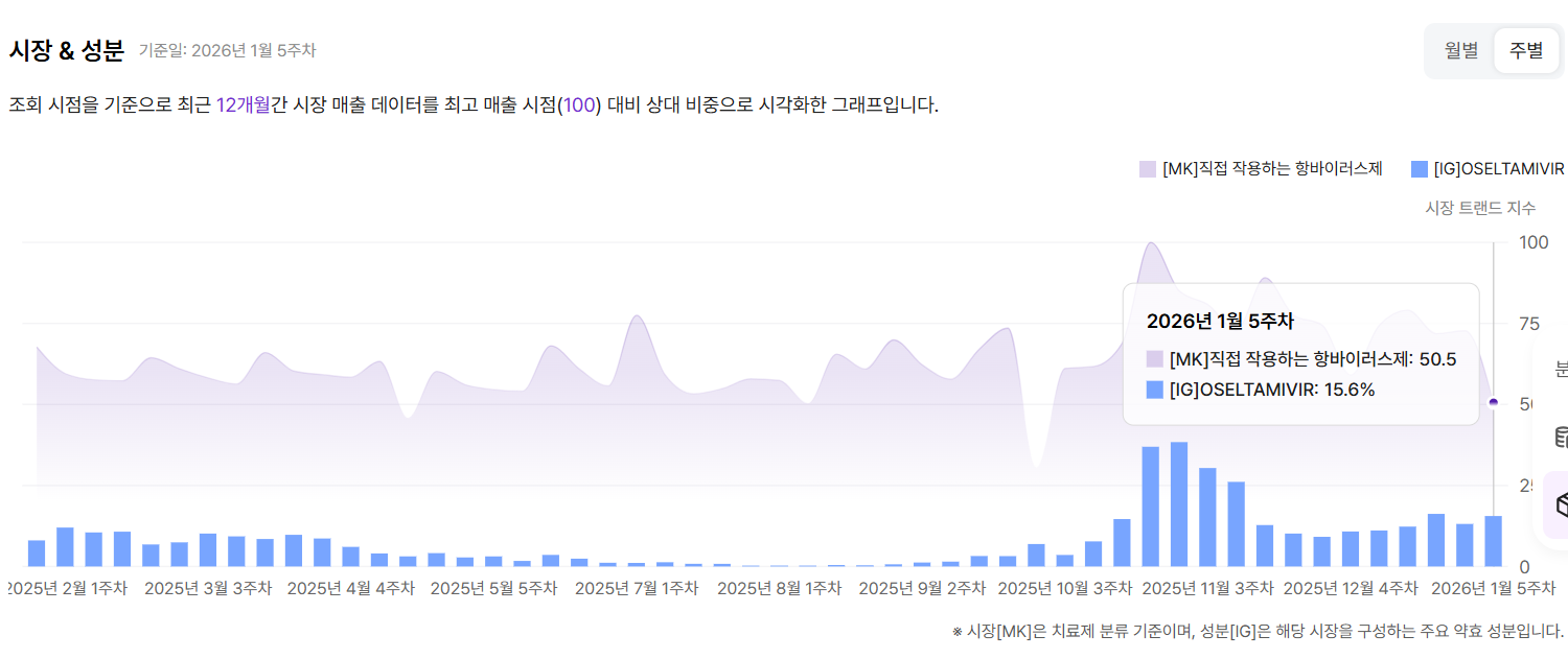 제약산업 데이터 분석 전문기업 비알피커넥트의 비알피인사이트(BRPInsight)에 따르면 오셀타미비르 시장 점유율은 ▲1월 1주차 11.1 ▲2주차 12.3% ▲3주차 16.2% ▲4주차 13.1% ▲5주차 15.6%로 소폭 증감률의 차이는 있었지만, 증가하는 추세를 보였다.