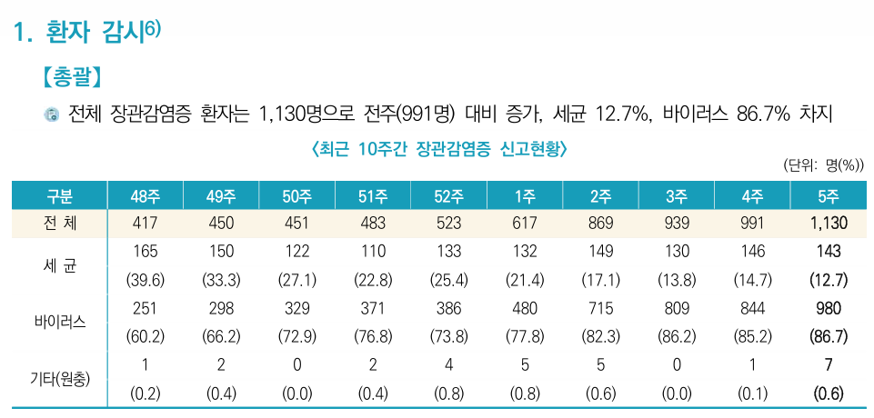 장염 환자도 급증했다. 질병청에 따르면 장관감염증 환자는 1130명으로 전주 991명 대비 14% 넘게 증가했다. 특히 노로바이러스 감염자가 전 주 대비 15.1% 증가하며, 최근 5년새 최다 발생을 보였다.