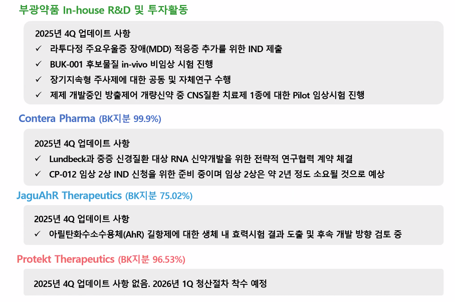 자회사 콘테라파마는 부광약품이 2014년 인수한 CNS 치료제 개발 전문 바이오텍으로, 파킨슨병 치료제 ‘CP-012’의 임상 1b상에서 긍정적인 톱라인 결과를 확보했다. 현재 임상 2상 진입을 위한 IND(임상시험계획) 신청 준비가 진행 중이며, 상반기 제출 후 하반기 환자 투약 개시를 목표로 하고 있다. 임상 기간은 약 2년으로 예상된다. CP-107, CP-108 등 후속 파이프라인 역시 적응증 확장과 기초 연구가 병행되고 있다.