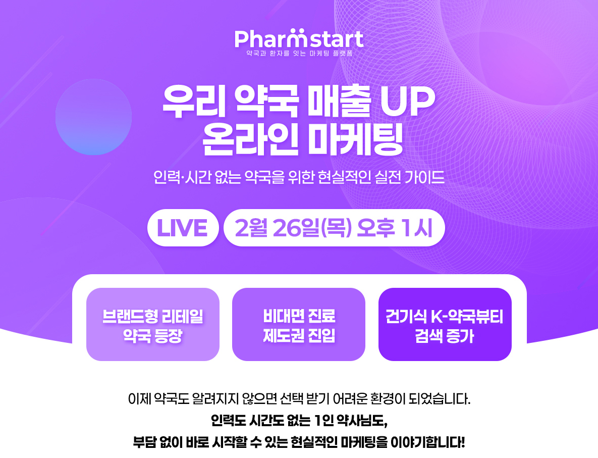이번 웨비나는 약사 스스로 현실적으로 적용할 수 있는 온라인 마케팅 활용법과 약국 경영 전략을 중심으로 진행 예정이며, 현직 약사와 마케팅 전문가가 직접 참여해 경험과 노하우를 공유하는 자리로 마련됐다.