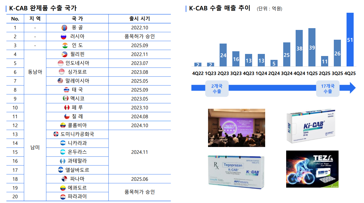 완제품 수출도 확대 흐름을 보였다. 케이캡 완제품은 4분기 기준 17개국으로 수출됐다. 관련 매출은 51억원으로 집계됐다. 중남미와 동남아 지역을 중심으로 출시 국가가 늘어나면서 완제품 수출 비중도 점진적으로 확대되는 모습이다.