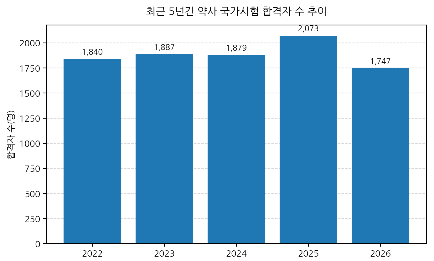 한국보건의료인국가시험원에 따르면 최근 5년간 배출된 신규 약사 수는 ▲2022년 1840명 ▲2023년 1887명 ▲2024년 1879명 ▲2025년 2073명 ▲2026년 1747명으로, 평균 1885명의 약사가 신규로 배출됩니다.