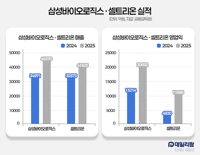 삼성바이오로직스와 셀트리온이 고성장을 거듭하며 전통제약사들과의 격차를 크게 벌렸다.