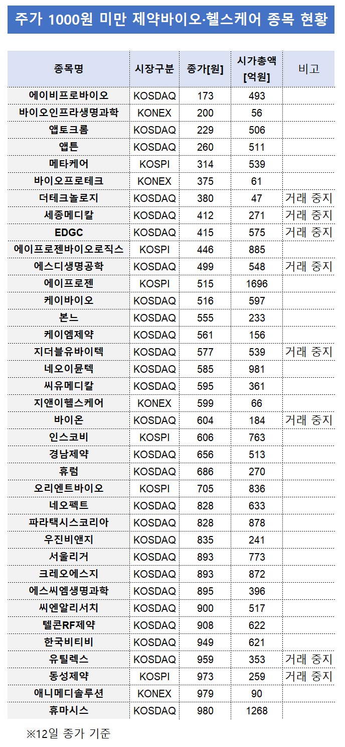 이 가운데 주가가 500원 미만인 종목은 11곳이다. 에이비프로바이오(173원), 바이오인프라생명과학(200원), 앱토크롬(229원), 앱튼(260원), 메타케어(314원), 바이오프로테크(375원), 더테크놀로지(380원), 세종메디칼(412원), EDGC(415원), 에이프로젠바이오로직스(446원), 에스디생명공학(499원) 등이다.