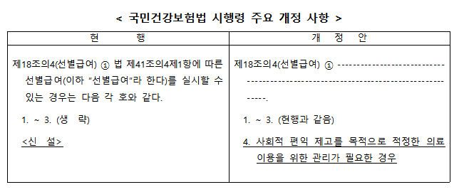 새 시행령은 과잉 진료 우려가 큰 비급여 항목을 건강보험 체계에서 관리할 근거를 마련하고자 '사회적 편익 제고를 목적으로 적정한 의료 이용을 위한 관리가 필요한 경우' 선별급여의 한 유형인 관리급여로 편입할 수 있도록 규정했다.