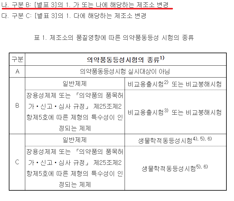 이에 식약처는 별표3을 연계해 품질에 영향이 없거나 경미한 제조방법 변경도 생물학적동등성시험 대신 비교용출시험으로 갈음하도록 했다.