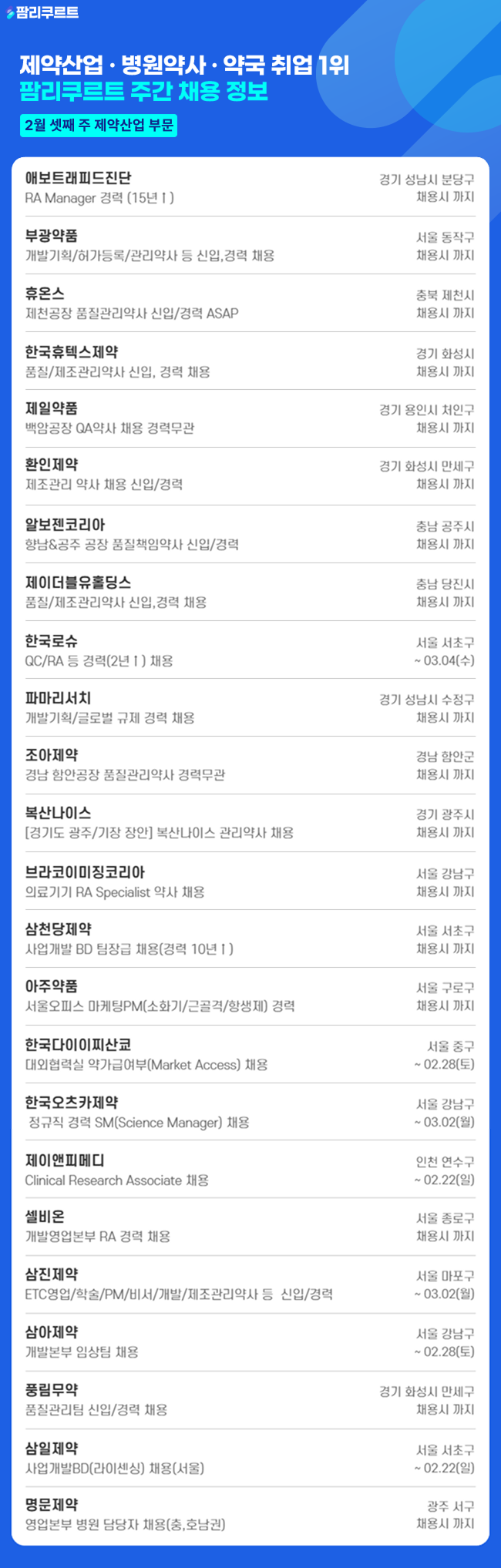 [팜리쿠르트] 조아제약·휴온스·제일약품 등 약사 채용