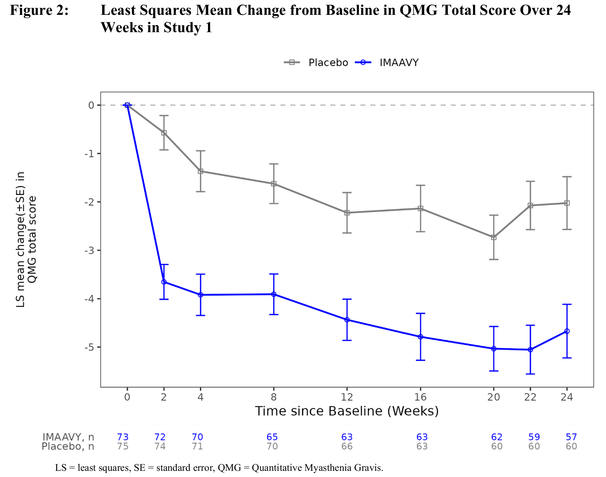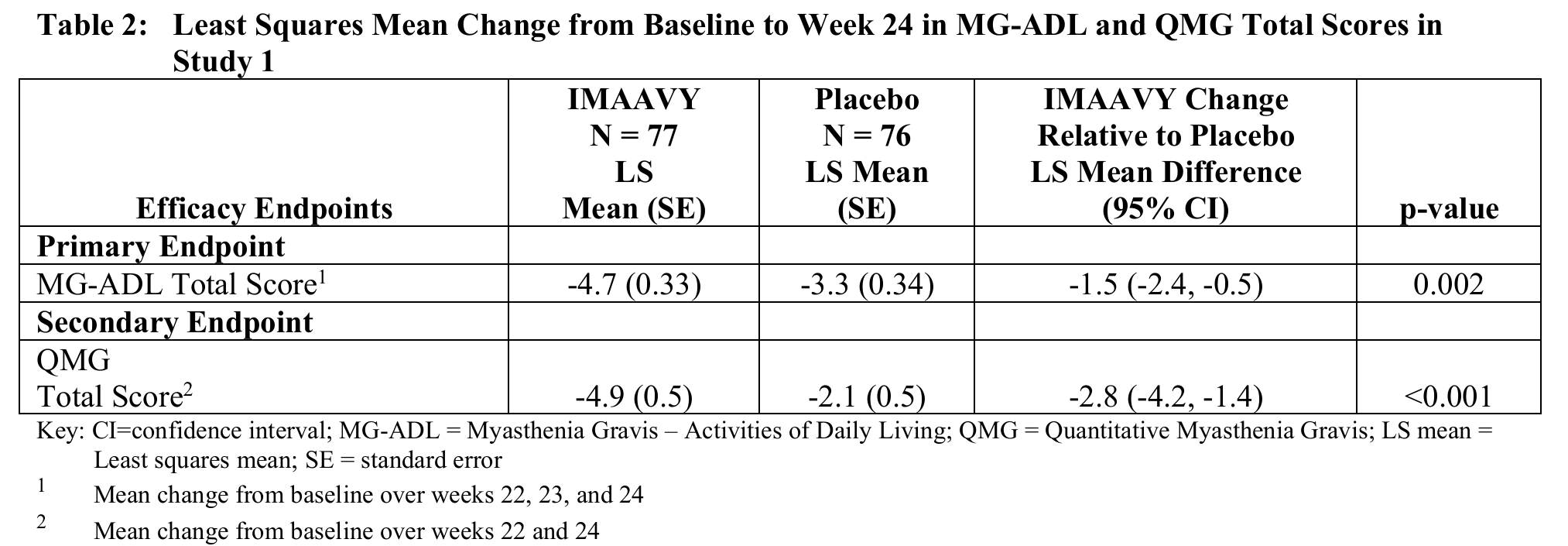 2차 평가변수는 QMG 총점에서 기저 시점 대비 22주 및 24주 시점까지의 평균 변화량을 치료군 간 비교한 것이었다. QMG 총점의 기저 대비 변화에서 IMAAVY군이 위약군보다 통계적으로 유의하게 우수한 결과를 보였다(p=0.001; Table 2 참조).