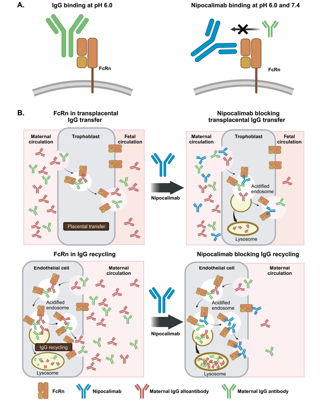 B. 니포칼리맙이 태반을 통한 IgG 전달과 모체 순환에서의 IgG 재활용을 억제하는 과정을 도식화한 그림이다. 태반을 통한 IgG 전달(좌측 상단)은 정상적으로 모체 IgG 항체(maternal alloantibody)와 EOS-HDFN에서 생성된 태아 적혈구 항원 특이 IgG 동종항체(maternal alloantibody)는 합포영양막(syncytiotrophoblast)에 의해 음세포작용(pinocytosis)으로 세포 내로 유입된다. 이후 엔도좀의 산성 환경에서 FcRn과 결합함으로써 리소좀 분해를 회피하고, 정단부(apical membrane)에서 기저부(basolateral membrane) 방향으로 이동하는 트랜스사이토시스를 통해 태아 혈관계로 전달된다.