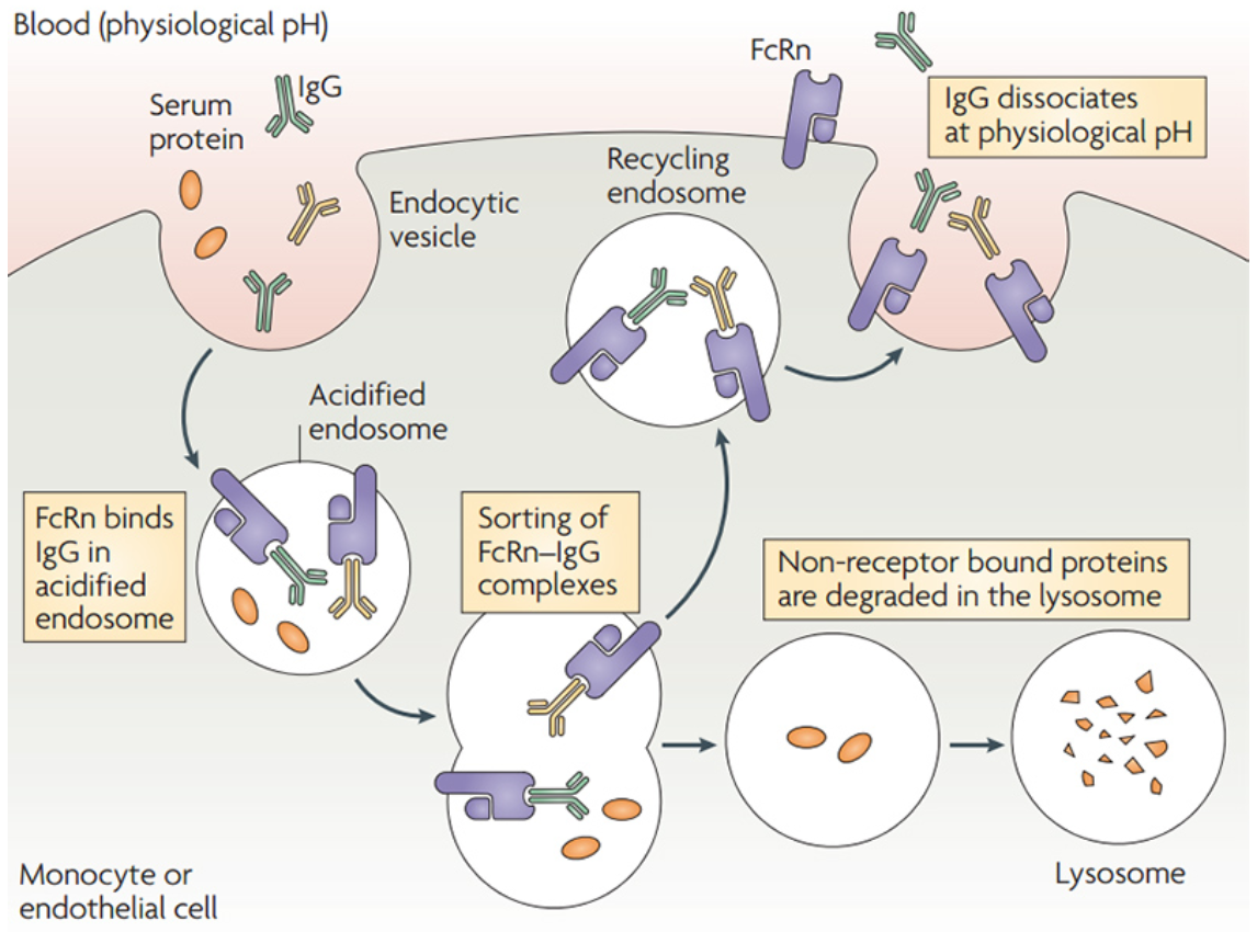 IgG는 약 2~4주의 긴 반감기를 가지며, 이는 FcRn 매개 재활용 기전에 의해 유지된다. 내피세포는 비특이적 엔도사이토시스를 통해 IgG를 세포 내로 섭취하고 산성화된 엔도솜을 형성한다(pH 6.0~6.5). 이 환경에서 IgG는 FcRn과 결합하여 리소좀 분해로부터 보호되고, 재활용 소낭을 통해 세포 표면으로 이동한 뒤 중성 또는 약알칼리성 조건(pH 7.0~7.5)에서 혈류로 방출된다(Figure 2).
