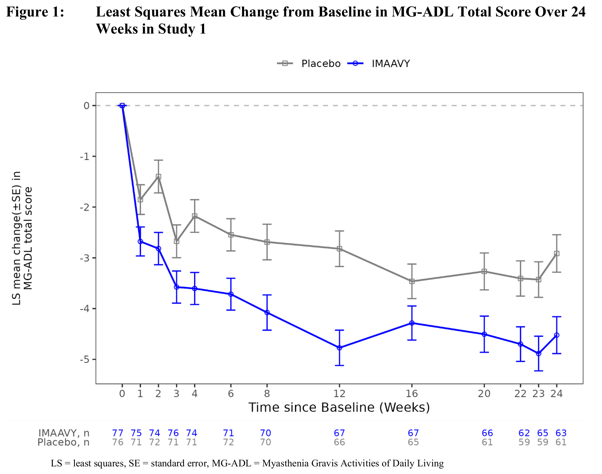 1차 유효성 평가변수는 MG-ADL 총점에서 기저 시점 대비 22, 23, 24주 시점까지의 평균 변화량을 치료군 간 비교한 것이었다. MG-ADL 총점의 기저 대비 변화에서 IMAAVY군이 위약군보다 통계적으로 유의하게 우수한 결과를 보였다(p=0.002; Table 2 및 Figure 1 참조).