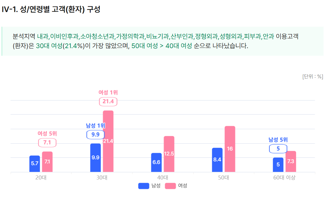 이용고객(환자)은 40대 여성이 14.4%로 가장 많았고 60대 이상 여성 14.2%, 40대 남성 12.3%, 50대 여성 11.9%, 30대 여성 11.8%, 60대 이상 남성 11.7%, 50대 남성 11.5%, 30대 남성 7%, 20대 여성 3.9%, 20대 남성 1.4% 순이었다.