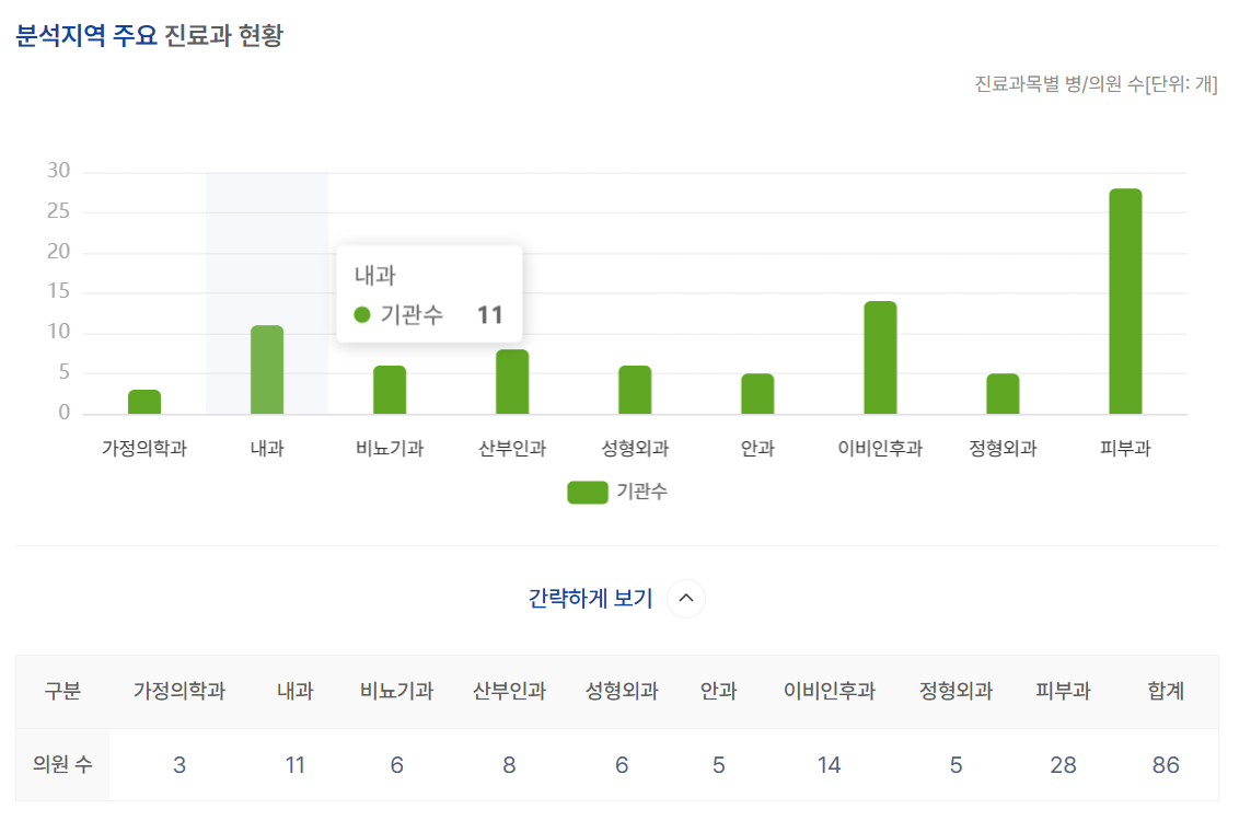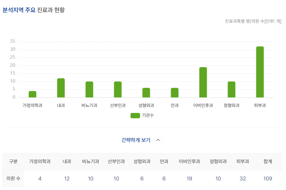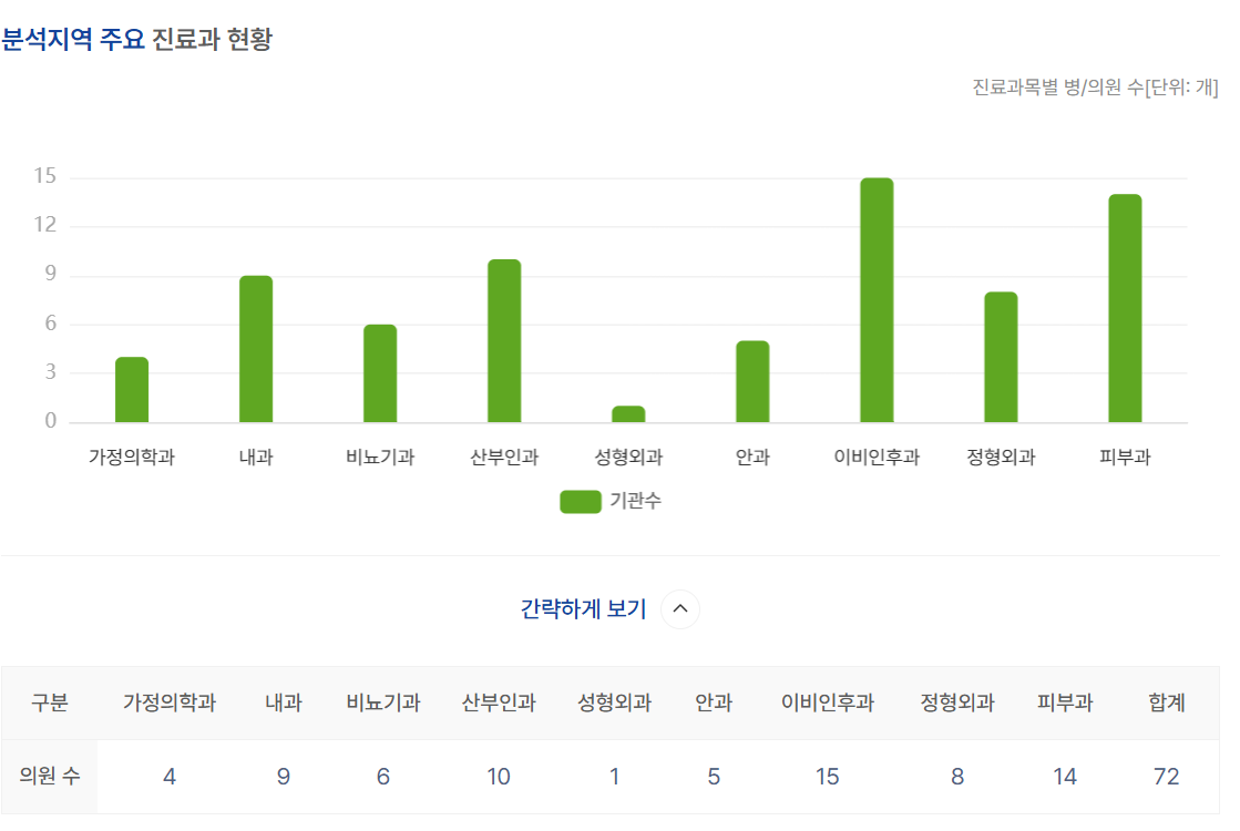 진료과는 이비인후과가 15곳으로 가장 많았고, 피부과 14곳, 산부인과 10곳, 내과 9곳, 정형외과 8곳, 비뇨기과 6곳, 안과 5곳, 가정의학과 4곳, 성형외과 1곳 순이었다.