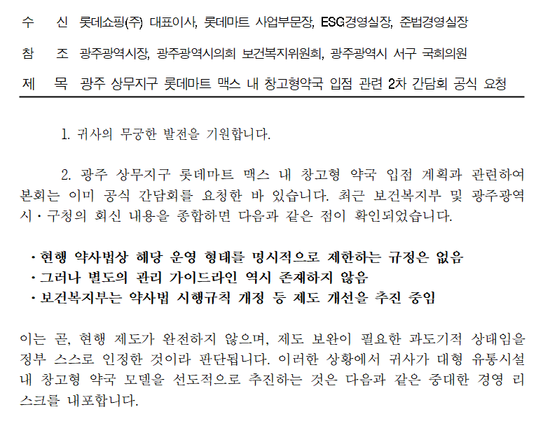 광주시약사회는 19일 롯데쇼핑 대표이사와 롯데마트 사업부문장, ESG 경영실장, 준법경영실장을 수신인으로 하는 '광주 상무지구 롯데마트 맥스 내 창고형 약국 입점 관련 2차 간담회'를 공식 요청하는 공문을 발송했다고 밝혔다.