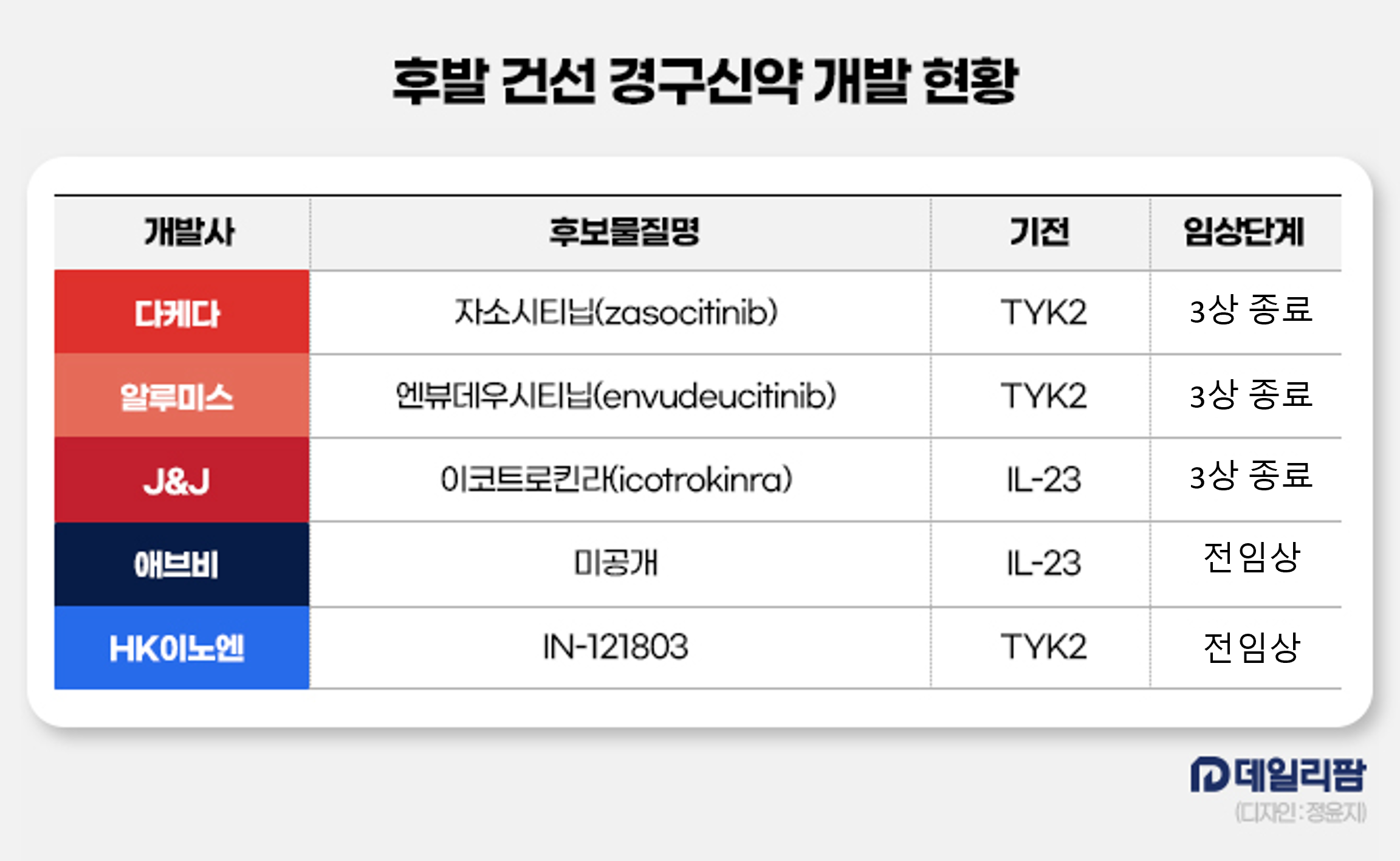 시장에서는 엔뷰데우시티닙이 경구제로 나올 수 있는 가장 강력한 TYK2 억제제 중 하나라는 평가도 나온다.