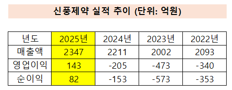 금융감독원 전자공시시스템에 따르면 신풍제약은 지난해 연결 기준 매출 2346억8065만원으로 전년 대비 6.15% 증가했다고 23일 공시했다. 같은 기간 영업이익은 142억5516만원으로 전년 영업손실 204억5543만원에서 흑자 전환했으며, 당기순이익도 82억3710만원을 기록해 흑자로 돌아섰다.